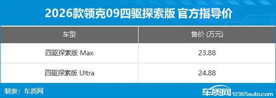 10月23日, 2026款领克09四驱探索版正式上市,新车共推出2款车型,官方指导价分别为23.88万元、24.88万元,限时专享价19.88万元和20.88万元。即日起至11月30日(含)前完成下订并提车,即享40000元购车补贴。